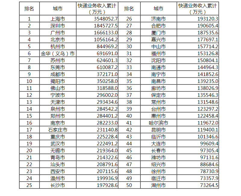 快遞業(yè)務(wù)收入前50位城市情況表