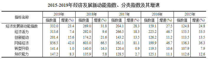 2015-2019年經(jīng)濟(jì)發(fā)展新動(dòng)能指數(shù)及分類指數(shù)