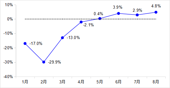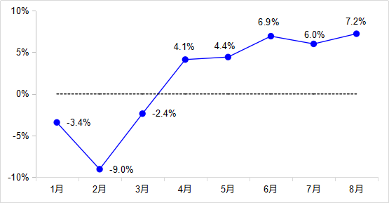 8月,完成貨運量43.1億噸,同比增長4.8%,增速較7月加快1.9個百分點,已恢復至去年同期水平,其中公路貨運量增長5.5%、水路貨運量增長0.6%。