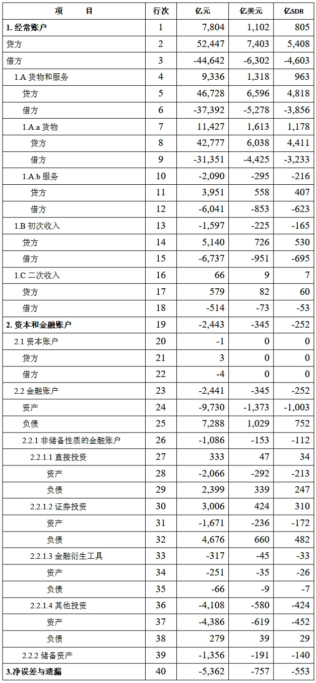 按SDR計值,2020年二季度,我國經(jīng)常賬戶順差805億SDR,資本和金融賬戶逆差252億SDR,其中,非儲備性質(zhì)的金融賬戶逆差112億SDR,儲備資產(chǎn)增加140億SDR。