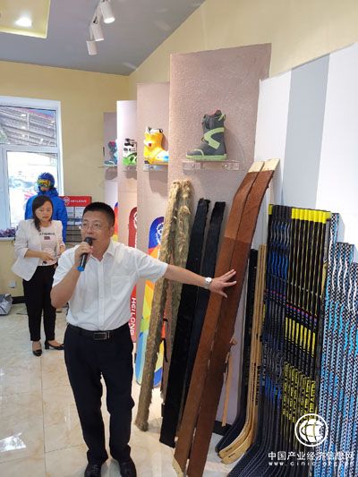 單志宏向媒體采訪團介紹最新研發(fā)的馬皮滑雪板