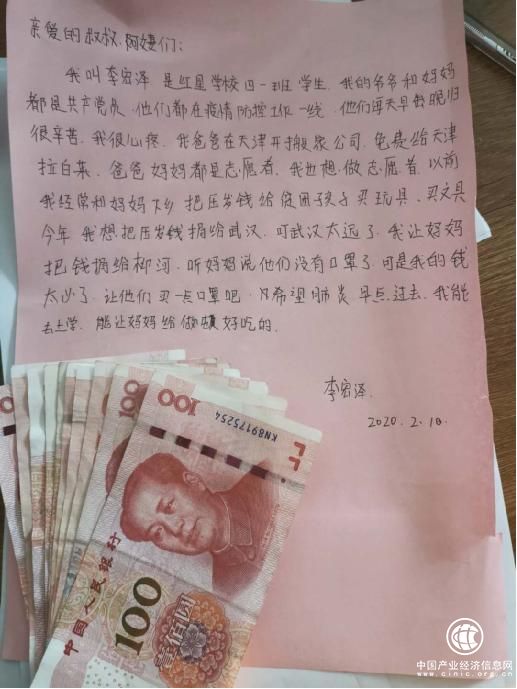2月10日,河南省方城縣紅星學(xué)校四年級(jí)8歲的學(xué)生李宏澤用稚嫩的小手給堅(jiān)守在家鄉(xiāng)方城縣柳河鎮(zhèn)疫情防控一線的黨員干部寫了一封信,并捐獻(xiàn)自己春節(jié)期間1000元的壓歲錢。