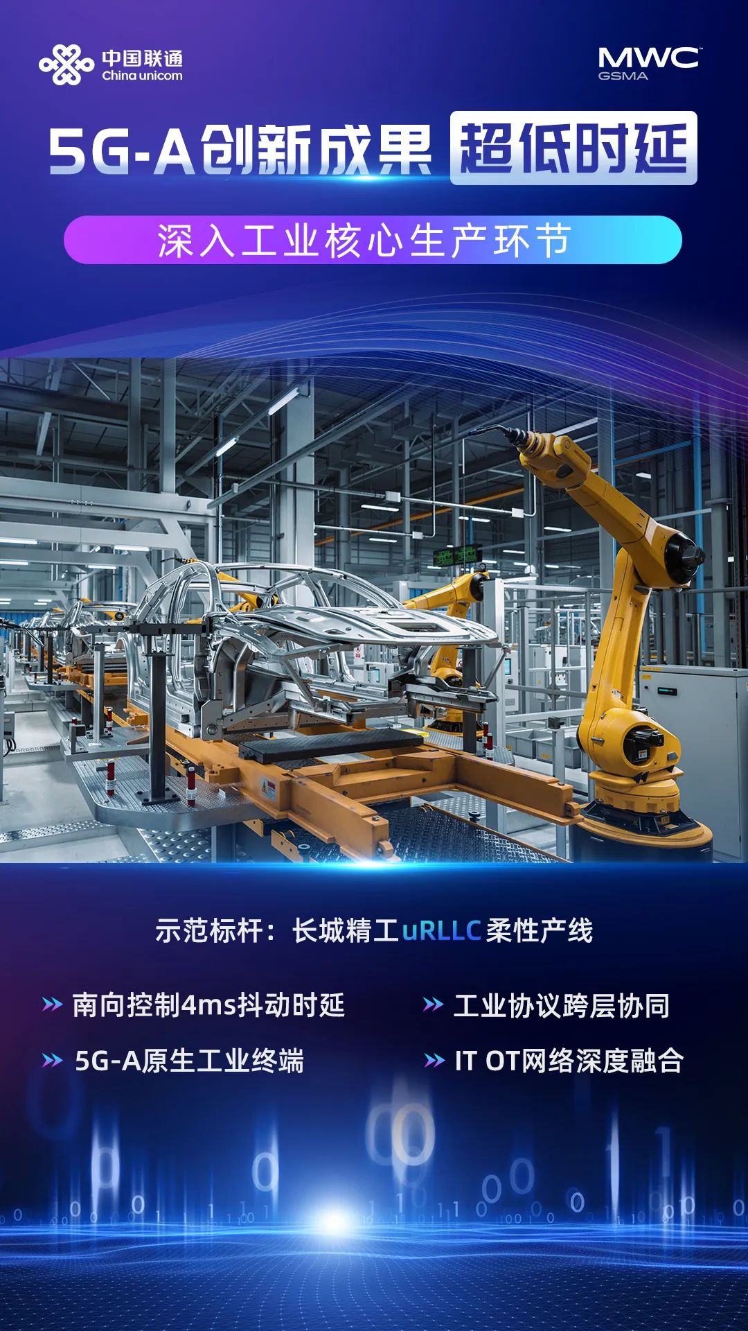 2024年世界移動通信大會期間,中國聯(lián)通以“算網(wǎng)為基 智領(lǐng)未來”為主題,攜手GSMA、法國電信、華為、施耐德、國網(wǎng)山東電力、西門子、高通等全球生態(tài)伙伴舉辦創(chuàng)新成果發(fā)布會,發(fā)布了聯(lián)通5G-A十大創(chuàng)新示范成果,旨在探索5G-A創(chuàng)新技術(shù)和商業(yè)模式,面向戰(zhàn)略性新興產(chǎn)業(yè)和未來產(chǎn)業(yè)培育新質(zhì)生產(chǎn)力,為中國式現(xiàn)代化筑牢數(shù)字“新引擎”。