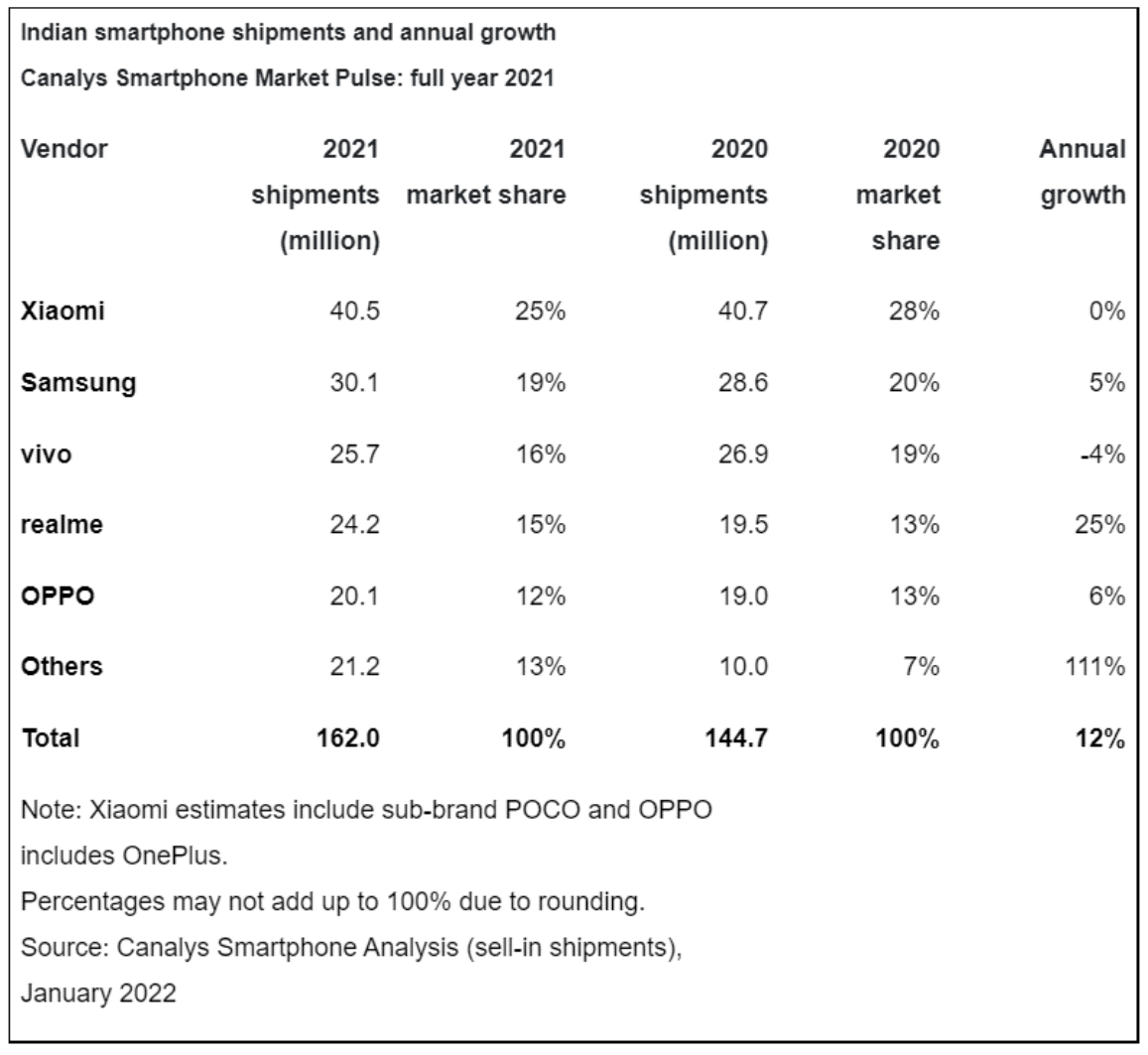 調(diào)研機構(gòu) Canalys 公布了 2021 年印度市場手機銷量排行榜,小米位列第一,三星第二,vivo、realme、OPPO 分列其后。