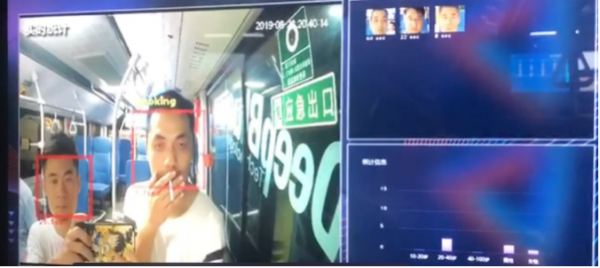 公交車屬于公共區(qū)域,其乘客身份復(fù)雜,個(gè)體的異常行為會(huì)影響到全車乘客的舒適度與出行安全性。針對(duì)公交車內(nèi)場(chǎng)景,深蘭科技為熊貓智能無人車部署了異常行為分析系統(tǒng),基于上文介紹的眼控廣告攝像頭對(duì)拍攝范圍內(nèi)每位乘客諸如吸煙、受傷、物品遺失,乃至偷竊等異常行為做出反饋,并在車內(nèi)顯示屏聯(lián)動(dòng)提醒。其具體功能包含: