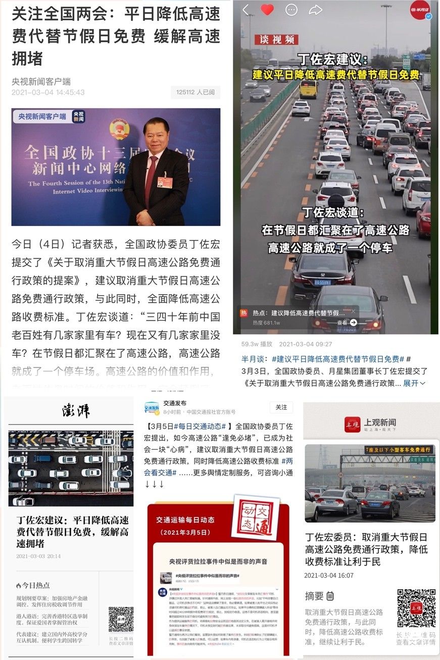 2021年全國兩會期間,全國政協(xié)委員、月星集團董事局主席丁佐宏向大會提交的一個關(guān)于“平日降低高速費代替節(jié)假日免費”的提案,因為聚焦社會堵點,事關(guān)民生痛點,引起廣大網(wǎng)友的廣泛熱議。央視新聞、半月談、中新網(wǎng)、上觀新聞、澎湃新聞在內(nèi)的眾多主流媒體紛紛報道,交通部主管的中國交通報也主動關(guān)注這個提案,相關(guān)話題一度上了熱搜。網(wǎng)民評價“這份提案靠譜”,是一份“為民著想”的好提案。