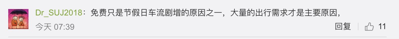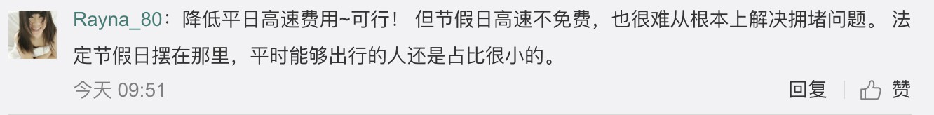 也有網(wǎng)友認為免費只是節(jié)假日車流劇增的原因之一,大量的出行需求才是主要原因。網(wǎng)友“Rayna-80”評論說,降低平日高速費用可行,但節(jié)假日高速不免費也很難從根本上解決問題,法定節(jié)假日是固定的,日常遠距離出行的人占比不高。