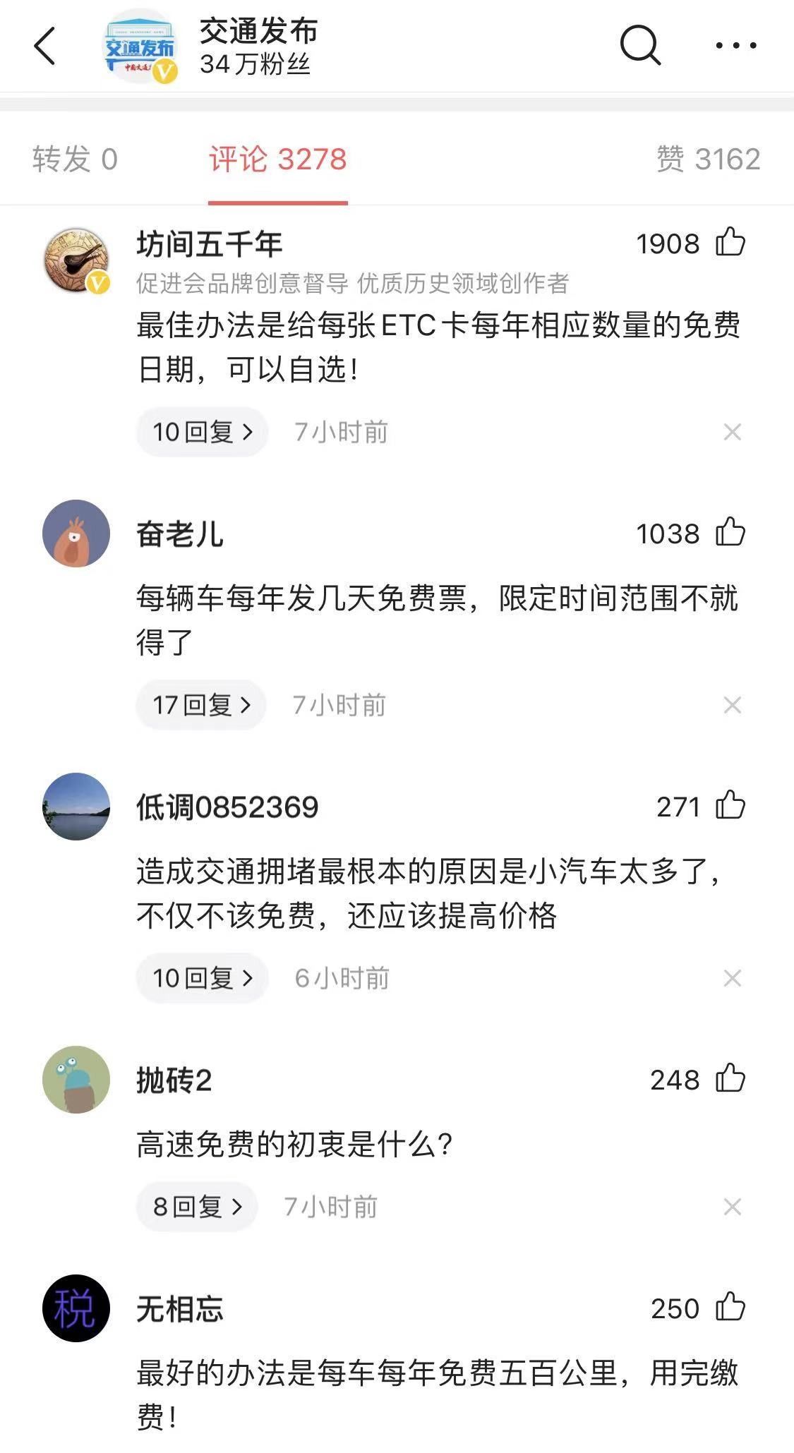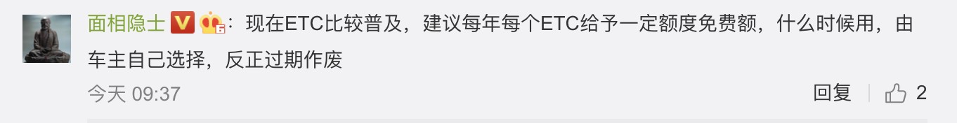 有網(wǎng)友還給出自己的建議。網(wǎng)友“面相隱士”說,現(xiàn)在ETC比較普及,建議每年每個ETC給予一定額度免費,什么時候用,由車主自己解決。