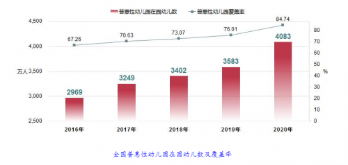 “十三五”期間,我國學前教育取得跨越式發(fā)展。教育部公布了一組數(shù)據(jù):2020年,全國幼兒園總數(shù)達到29.17萬所,在園幼兒總數(shù)達到4818.26萬,與2015年相比,幼兒園數(shù)量增加了30%,在園幼兒規(guī)模增長了13%。全國學前三年毛入園率達到85.2%,增加10.2個百分點,普惠性幼兒園覆蓋率達到84.74%,比2016年增加17.5個百分點。