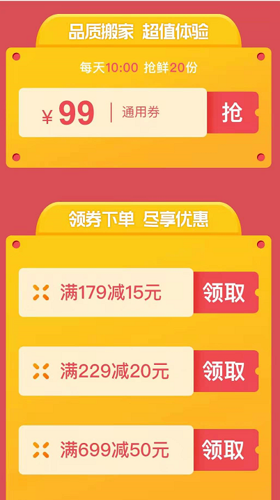 活動指南之如何使用優(yōu)惠券:(1)APP:【注冊并登陸自如APP】-【首頁】-【搬家】;(2)微信小程序:【微信搜索“自如搬家”】進(jìn)入小程序;(3)【99元無門檻】優(yōu)惠券【每天10點(diǎn)】限量【20份】,活動期間領(lǐng)完即止;(4)自如搬家179-15元券、229-20元券;699-50元券,適用于自如小搬、中搬和大搬。