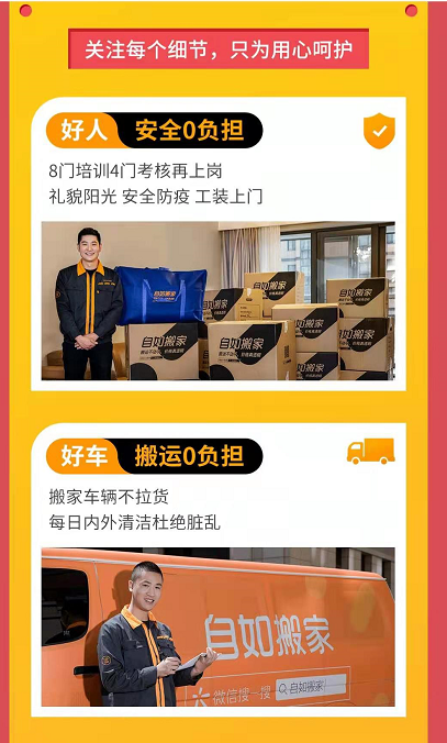 自如搬家之三重保障:保障一:好人,安全0負(fù)擔(dān):自如搬家?guī)煾到?jīng)過8門培訓(xùn),4門考核之后再上崗,專業(yè)能力強(qiáng),精通搬家業(yè)務(wù),同時(shí),搬家人員陽光禮貌,安全防疫,工裝上門;保障二:好車,搬運(yùn)0負(fù)擔(dān):自如搬家車輛不拉貨,每日內(nèi)外清潔杜絕臟亂,全面保障租客物品的清潔干凈整齊;保障三:好服務(wù),心情0負(fù)擔(dān):北京自如支持先搬后付,租客若是不滿,可以要求直接返工,同時(shí),搬家過程中明碼標(biāo)價(jià),沒有任何隱藏收費(fèi),讓租客完全放心。