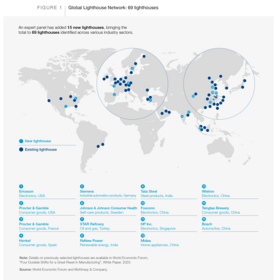 “燈塔工廠”(Lighthouse Network),是由世界經(jīng)濟(jì)論壇(WEF)和麥肯錫咨詢公司共同遴選“數(shù)字化制造”和“全球化 4.0”的示范者,被視為第四次工業(yè)革命的領(lǐng)路者。入選燈塔工廠,則意味著企業(yè)在大規(guī)模采用新技術(shù)方面走在世界前沿,并在業(yè)務(wù)流程、管理系統(tǒng)以及工業(yè)互聯(lián)網(wǎng)、數(shù)據(jù)系統(tǒng)等方面都有著卓越而深入的創(chuàng)新。