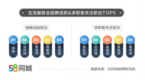 隨著居民生活水平的提高,人們享受生活、健康生活的意識也逐漸提升,足療保健、美容按摩行業(yè)快速發(fā)展。58同城招聘研究院發(fā)布的生活服務(wù)業(yè)數(shù)據(jù)顯示,足療師、按摩師已經(jīng)成為求職者爭相投遞的崗位,求職投遞同比增速均在40%以上;其中按摩師平均支付月薪為11307元,足療師平均支付月薪也在10000元以上。此外,除足療師、按摩師外,美容師、發(fā)型師、美甲師也躋身求職熱門職業(yè)TOP5。