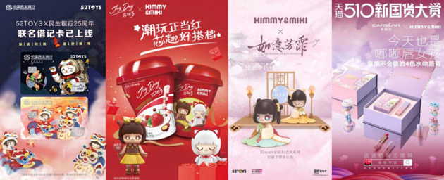 近年來,52TOYS與互聯(lián)網(wǎng)、快消、美妝、文娛、體育等多領(lǐng)域跨界合作。推出包括Kimmy&Miki×《如意芳霏》聯(lián)名款禮盒、Kimmy&Miki×伊利芯趣多JoyDay聯(lián)名禮盒、Kimmy&Miki×潘婷小彩蛋聯(lián)名發(fā)膜、52TOYS×中國民生銀行聯(lián)名借記卡、52TOYS×漢口二廠聯(lián)名限定盲瓶、52TOYS×長隆合作款猛獸匣、52TOYS×花點時間聯(lián)名治愈苔蘚盲盒等,每一場碰撞都給人們帶來驚喜,每一次合作都引發(fā)現(xiàn)象級的效應(yīng)。52TOYS正在將它的創(chuàng)意覆蓋更多領(lǐng)域,真正為年輕人創(chuàng)造有趣的生活方式。