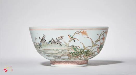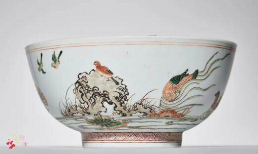 碗口微敞,深腹下斂,圈足,胎質(zhì)細(xì)密,釉面瑩白。碗外壁五彩繪荷塘秋禽之景:荷塘山石蘆葦之間,鴛鴦翠鳥,或在颯颯秋風(fēng)中展翅雙飛,或在岸邊草叢間成對覓食,或靜立于蘆葦枝頭,或停駐暫歇于枯石。鴛鴦逡巡水上,層層漣猗泛起,又如秋風(fēng)乍起,波光粼粼。水面上,荷葉已黃半邊,隨風(fēng)搖曳,與嶙峋石岸、石間野草相映襯,圖中設(shè)色濃淡分明,空間層次感強(qiáng),荷塘秋景,幽謐天成,極富野趣。
