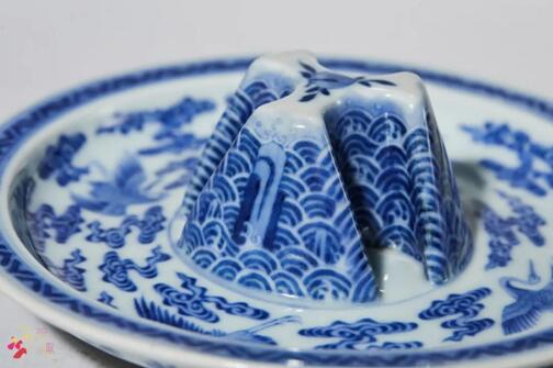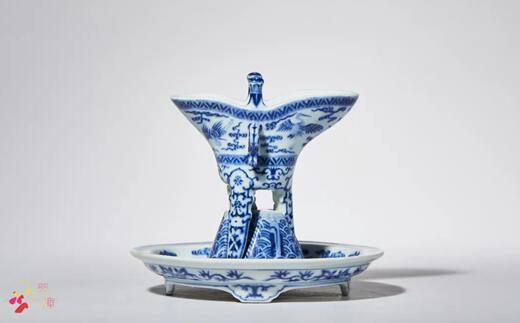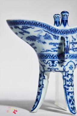 下承三個(gè)尖狀長足,器身青花為飾,爵身主體紋飾為云鶴紋,寓意長壽。三足以變形蕉葉裝飾,構(gòu)思巧妙。以青銅器古樸瑰麗的造型與清代紋飾相結(jié)合,煥發(fā)出新穎的藝術(shù)魅力。