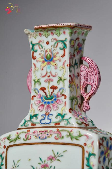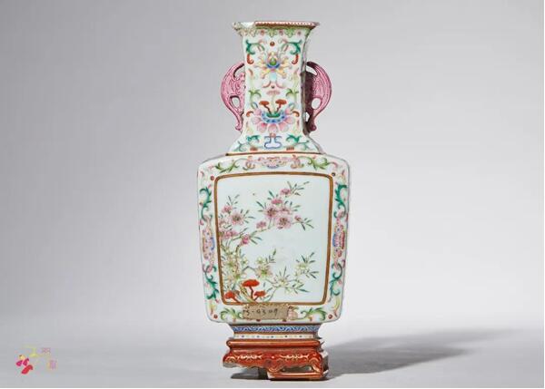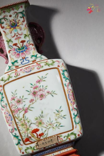 拍品為一側(cè)平面,撇口,長頸,折肩,腹部近底稍斂,下承托泥,頸部兩側(cè)貼塑雙蝠耳。通體飾粉彩纏枝蓮紋,腹部開光繪粉彩桃花紋飾,花團(tuán)錦簇,風(fēng)姿綽約,呈現(xiàn)出富貴祥和的氣派。底書礬紅彩“乾隆年制”四字篆書橫款。