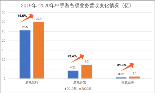 財報顯示,中手游營業(yè)收入主要來自三個業(yè)務(wù)板塊:游戲發(fā)行、游戲開發(fā)和授權(quán)業(yè)務(wù)。其中游戲發(fā)行收入29.78億元,同比增長16.6%,營收占比為78%,游戲開發(fā)收入達7.30億元,同比增長73.4%,營收占比為19.1%,授權(quán)業(yè)務(wù)收入為1.1億元,占比接近3%。從營收變化情況可以明顯看出,發(fā)行在中手游業(yè)務(wù)中的比例明顯下降,已然不足八成,而自研業(yè)務(wù)正在成為中手游的新增長點。