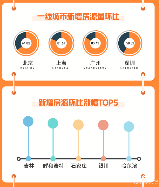 從全國市場(chǎng)供應(yīng)方面來看,58同城、安居客報(bào)告顯示全國新增掛牌房源量環(huán)比上漲83.9%。一線四城均有不同程度的上漲,其中,廣州環(huán)比漲幅最高達(dá)到83.4%。從全國范圍來看,吉林、呼和浩特、石家莊、銀川和哈爾濱的新增房源環(huán)比漲幅領(lǐng)先其他城市。