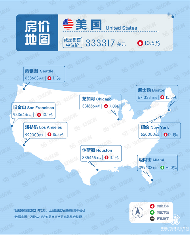 根據(jù)58同城、安居客《3月海外地產(chǎn)房?jī)r(jià)地圖》顯示,截止2021年2月,美國(guó)成屋銷(xiāo)售中位價(jià)為333317美元,同比上漲10.6%。洛杉磯以999000美元的成屋銷(xiāo)售中位價(jià)領(lǐng)先其他地區(qū),舊金山和波士頓分別以983644美元、671333美元緊跟其后,同比分別上漲13.1%和15.5%。紐約成屋銷(xiāo)售中位價(jià)為650000美元,同比上漲12.1%;邁阿密、休斯頓和芝加哥均處于30萬(wàn)美元以上水平。
