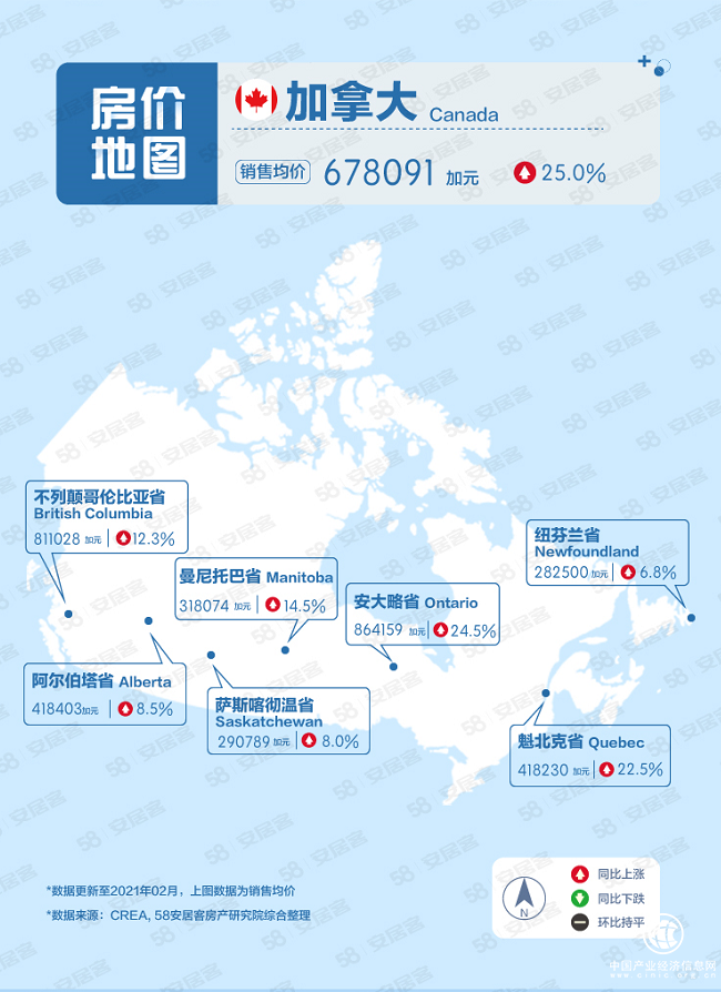 截止2021年2月,加拿大房屋銷(xiāo)售均價(jià)為678091加元,同比上漲25%,漲幅處于相對(duì)較高水平。分地區(qū)來(lái)看,安大略省以864159加元的銷(xiāo)售均價(jià)排名最高,不列顛哥倫比亞省以811028加元的銷(xiāo)售均價(jià)緊隨其后。魁北克省銷(xiāo)售均價(jià)為418230加元,同比上漲22.5%。薩斯喀徹溫省和紐芬蘭省均處于20萬(wàn)加元以上梯隊(duì)。