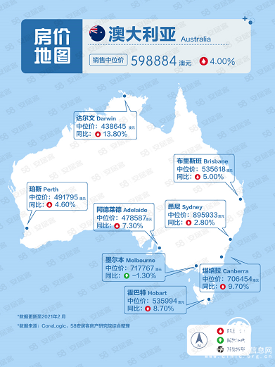 58安居客房產(chǎn)研究院綜合整理澳大利亞房?jī)r(jià)顯示,2021年2月房屋銷(xiāo)售中位價(jià)為598884澳元,同比上漲4.0%。悉尼房屋銷(xiāo)售中間價(jià)為895933澳元,領(lǐng)先其他區(qū)域。墨爾本房屋銷(xiāo)售中間價(jià)以717767澳元的水平排在其后。首都堪培拉房屋銷(xiāo)售中間價(jià)為706454澳元躋身前三。布里斯班和霍巴特房屋銷(xiāo)售中間價(jià)均處于50萬(wàn)澳元以上水平。
