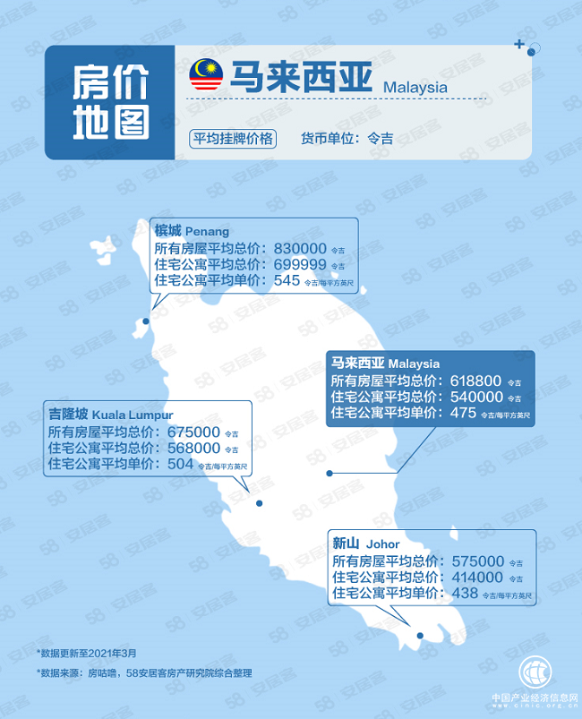 58同城、安居客《海外地產(chǎn)房?jī)r(jià)地圖》顯示,截至2021年3月,馬來(lái)西亞所有房屋平均總價(jià)為618800令吉,住宅公寓平均總價(jià)為540000令吉,住宅公寓平均單價(jià)為475令吉/平方英尺。位于第一梯隊(duì)的檳城所有房屋平均總價(jià)為830000令吉,住宅公寓平均總價(jià)為699999令吉,住宅公寓平均單價(jià)為545令吉/平方英尺。第二梯隊(duì)的吉隆坡所有房屋平均總價(jià)為675000令吉,住宅公寓平均總價(jià)為568000令吉,住宅公寓平均單價(jià)為504令吉/平方英尺。第三梯隊(duì)的新山所有房屋平均總價(jià)為575000令吉,住宅公寓平均總價(jià)為414000令吉,住宅公寓平均單價(jià)為438令吉/平方英尺。