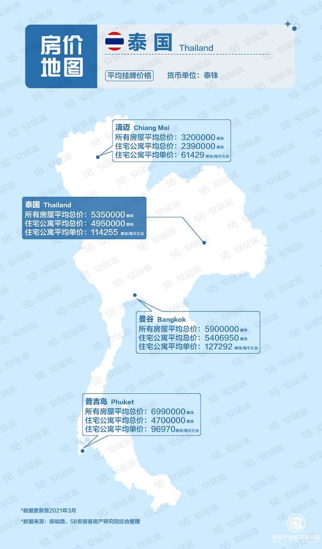 截止2021年3月份數(shù)據(jù),泰國(guó)所有房屋平均總價(jià)為5350000泰銖,住宅公寓平均總價(jià)為4950000泰銖,住宅公寓平均單價(jià)為114255泰銖/平方米。普吉島所有房屋平均總價(jià)最高為6990000泰銖,曼谷所有房屋均價(jià)低于普吉島為5900000泰銖,但是曼谷住宅公寓平均總價(jià)5406950泰銖、住宅公寓平均單價(jià)127292泰銖/平方米,均高于普吉島的4700000泰銖總價(jià)和96970泰銖/平方米平均單價(jià)。清邁處于相對(duì)較低水平,所有房屋平均總價(jià)為3200000泰銖,住宅公寓平均總價(jià)為2390000泰銖,住宅公寓平均單價(jià)為61429泰銖/平方米。
