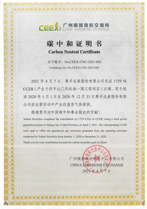 粵開證券碳中和經(jīng)由第三方核查機構進行認證,由廣州碳排放權交易所監(jiān)督確認,與經(jīng)核證的排放量相等的減排量在國家自愿減排登記薄上實現(xiàn)注銷,并頒發(fā)碳中和證書,成為全國首家實現(xiàn)碳中和的持牌金融機構。