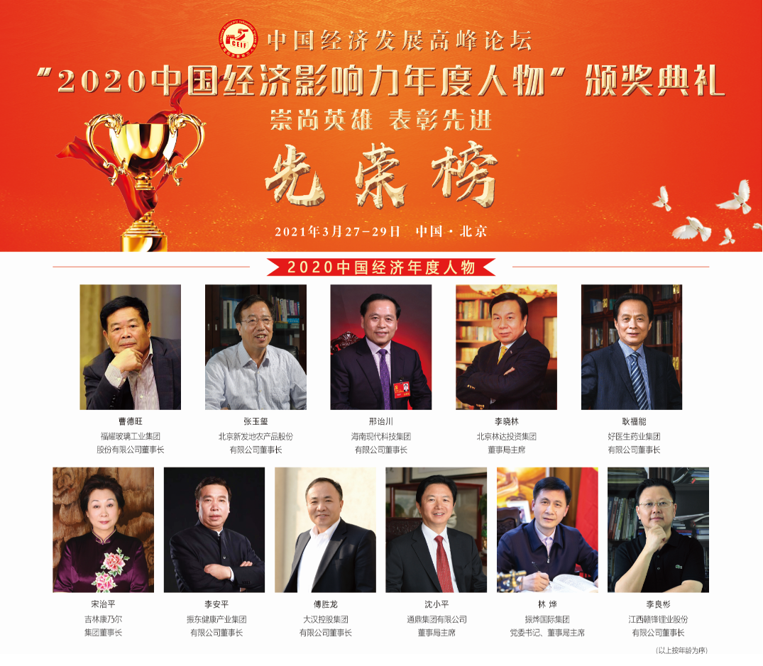 福耀玻璃工業(yè)集團(tuán)股份有限公司董事長曹德旺,北京市新發(fā)地農(nóng)產(chǎn)品股份有限公司董事長張玉璽,海南現(xiàn)代科技集團(tuán)有限公司董事長邢詒川,北京林達(dá)投資集團(tuán)有限公司董事局主席李曉林,好醫(yī)生藥業(yè)集團(tuán)有限公司董事長耿福能,吉林康乃爾集團(tuán)董事長宋治平,振東健康產(chǎn)業(yè)集團(tuán)董事長李安平,大漢控股集團(tuán)有限公司董事長傅勝龍,通鼎集團(tuán)有限公司董事局主席沈小平,振燁國際集團(tuán)黨委書記、董事局主席林燁,江西贛鋒鋰業(yè)股份有限公司董事長李良彬分別榮膺“2020中國經(jīng)濟(jì)年度人物”大獎。