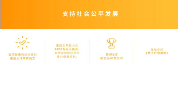 2020年,集團全年投入近1800萬元人民幣,支持全球團隊成員身心健康福利。截至2020年底,集團全球已有3400多名團隊成員分布在13個國家和地區(qū)。獲得年度最佳雇主、中國健康工作場所黃金標(biāo)準(zhǔn)認(rèn)證企業(yè)等5項認(rèn)可。