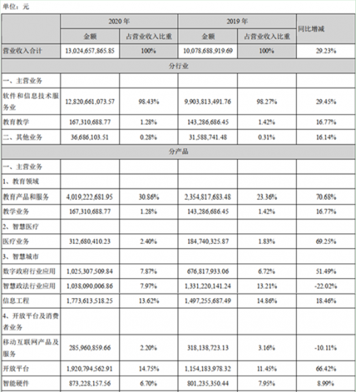 其細(xì)分業(yè)務(wù)營(yíng)收主要由教育、智慧醫(yī)療、智慧城市、開放平臺(tái)及消費(fèi)者業(yè)務(wù)、汽車領(lǐng)域、智能服務(wù)等構(gòu)成。其中智慧教業(yè)務(wù)營(yíng)收育40.19億元,同比增長(zhǎng)70.68%,占營(yíng)業(yè)收入比重30.86%;智慧醫(yī)療營(yíng)收同比增長(zhǎng)69.25%。