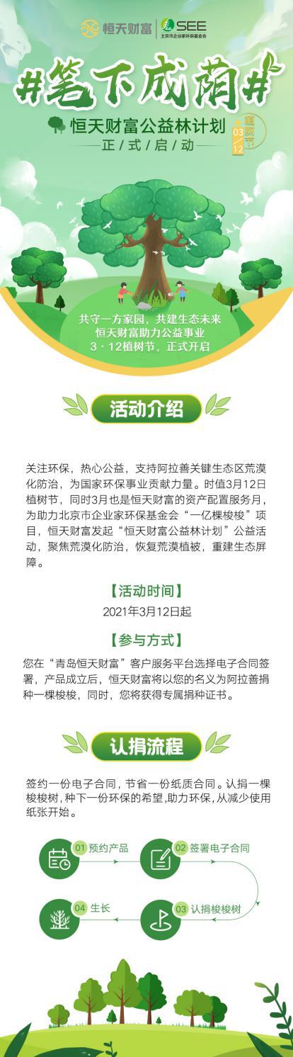 3月12日,財(cái)富管理行業(yè)知名頭部機(jī)構(gòu)恒天財(cái)富正式啟動(dòng)了“恒天財(cái)富公益林計(jì)劃”,支持北京市企業(yè)家環(huán)?;饡?huì)(以下簡(jiǎn)稱:SEE基金會(huì))的“一億棵梭梭”項(xiàng)目,并號(hào)召通過(guò)簽署電子合同來(lái)減少使用紙張,詮釋保護(hù)生態(tài)環(huán)境、改善人居生活環(huán)境的責(zé)任擔(dān)當(dāng)。