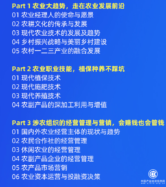 課程內(nèi)容:主要包含五大塊:農(nóng)業(yè)大趨勢(shì)、農(nóng)業(yè)職業(yè)技能、涉農(nóng)組織的經(jīng)營(yíng)管理與營(yíng)銷、個(gè)人能力提升、法律法規(guī)與制度流程;應(yīng)該說(shuō)是非常完整的五個(gè)方向。