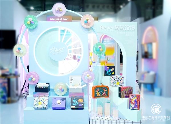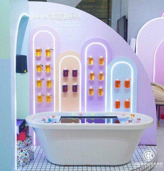 Rever黃金沐浴油整齊的掛在巨型浴缸旁邊,八款萌萌噠浴爆球組成了摩天輪上下翻飛,網(wǎng)紅爆品巧克力系列轉(zhuǎn)轉(zhuǎn)浴爆足浴套組和其他套裝則優(yōu)雅地迎接人們炙熱的眼光。Rever正在通過多維感官體驗給人們帶來夢幻玩趣享受。