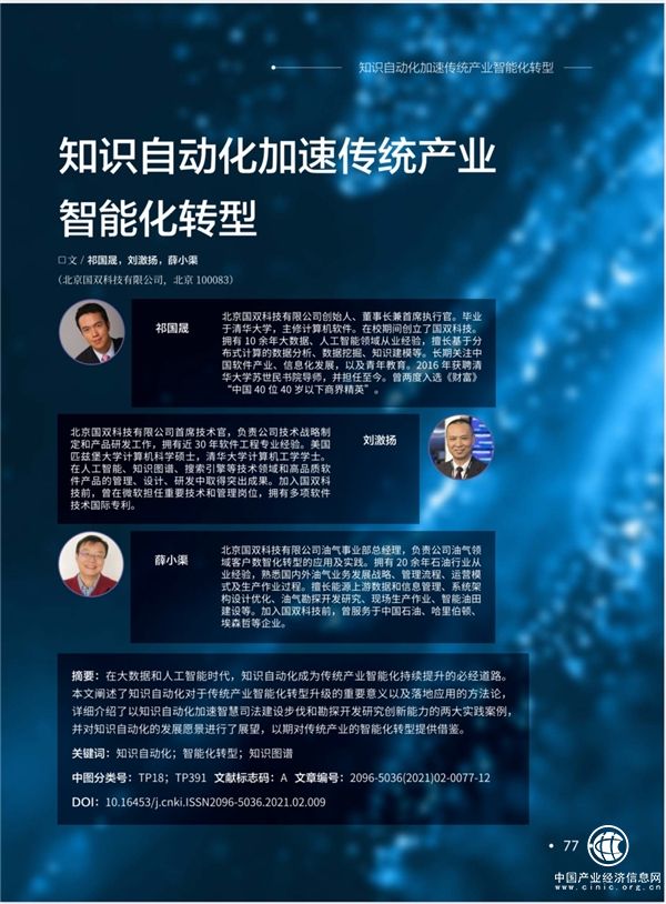 2021年5月,國(guó)雙《知識(shí)自動(dòng)化加速傳統(tǒng)產(chǎn)業(yè)智能化轉(zhuǎn)型》一文受邀刊發(fā)于國(guó)家一級(jí)期刊CN10-1530/TP《人工智能》第21期。這標(biāo)志著國(guó)雙在人工智能領(lǐng)域的專業(yè)技術(shù)和場(chǎng)景化落地能力再次受到權(quán)威機(jī)構(gòu)的認(rèn)可。