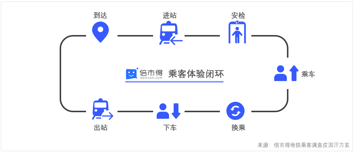 為此,項(xiàng)目團(tuán)隊(duì)改進(jìn)了該地鐵集團(tuán)原有的固定模塊、整體評(píng)估的方式,將乘客搭乘流程中的不同觸點(diǎn)提取出來(lái),從進(jìn)站、購(gòu)票、候車、乘車、換乘、出站、車站環(huán)境、公共設(shè)施等分別進(jìn)行評(píng)估。