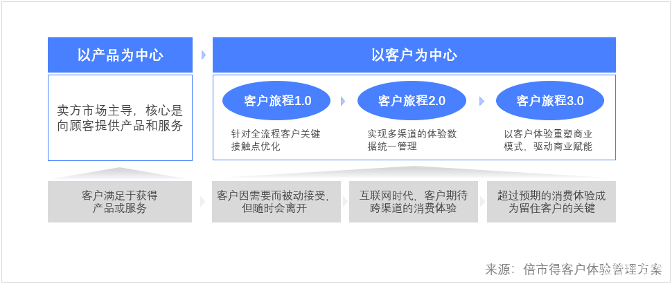 1 ) 從“產(chǎn)品為中心”到“客戶為中心”: 客戶滿意更多以產(chǎn)品為中心,例如我有什么功能,是否達(dá)到了客戶的預(yù)期;而客戶體驗(yàn)則更多以客戶為中心,客戶旅程是怎樣的,在整個(gè)客戶旅程中,客戶更高層次的需求是什么等。