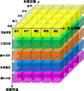 該架構(gòu)包括三個維度,一是生命周期的維度,包括產(chǎn)品的設(shè)計、生產(chǎn)、銷售、服務(wù)。二是系統(tǒng)層級的維度,從底層的設(shè)備到上面的車間,再到企業(yè)以及企業(yè)之間的協(xié)同。三是智能特征的維度,就是萬物互聯(lián)IoT等,以及工業(yè)大腦、大數(shù)據(jù)都可以融合到智能特征。