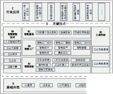 《國家智能制造標(biāo)準(zhǔn)體系建設(shè)指南(2018年版)》同時提出了智能制造標(biāo)準(zhǔn)體系結(jié)構(gòu),他包括了A基礎(chǔ)共性,B關(guān)鍵技術(shù),C行業(yè)應(yīng)用,從下往上,主要反映標(biāo)準(zhǔn)體系各部分的組成關(guān)系,與智能制造系統(tǒng)架構(gòu)具有映射關(guān)系。