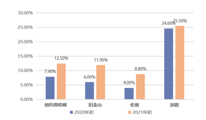 從國際上來看,世界主要都市寫字樓空置率疫情前大多為個位數(shù),例如紐約曼哈頓2020年初空置率為7.9%,舊金山約為6%,倫敦約為4%。受疫情影響,這些城市的寫字樓空置率大幅攀升,今年一季度紐約空置率12.5%,舊金山11.9%,倫敦8.8%,多數(shù)達到近20年高點。和發(fā)達國家主要都市相比,深圳的甲級寫字樓空置率確實相對較高。