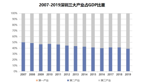 從需求背后的經(jīng)濟結(jié)構(gòu)來看,近年來,盡管深圳大力促進經(jīng)濟轉(zhuǎn)型,卻并未摒棄制造業(yè),而是促進“加工代工”轉(zhuǎn)向“智造創(chuàng)造”,努力把傳統(tǒng)產(chǎn)業(yè)改造成高附加值的優(yōu)勢產(chǎn)業(yè)。到2019年底,深圳第二產(chǎn)業(yè)占GDP的比重仍高達38.98%,僅比2008年時減少了10%。這樣的三產(chǎn)結(jié)構(gòu),和北上廣以及歐美等發(fā)達國家的重點城市相去甚遠。很明顯第二產(chǎn)業(yè)企業(yè)尤其是工業(yè)企業(yè)需要的大多是廠房,較少會選擇寫字樓、特別是甲級寫字樓作為其辦公場所。
