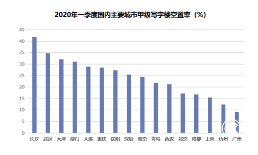 在國內(nèi)范圍,一線城市中,深圳的甲級寫字樓空置率最高,廣州最低。截至2020年中,54%的全國主要城市寫字樓空置率超過25%,94%的城市空置率超過10%。從這一角度看,寫字樓高空置率是一個全國普遍的現(xiàn)象,并非深圳獨有。