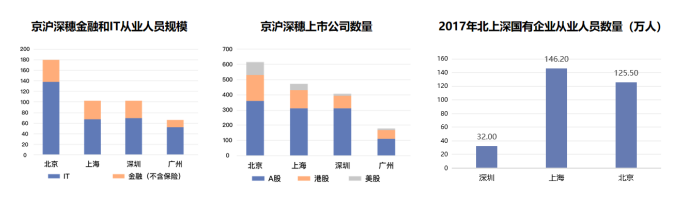 除此以外,數(shù)據(jù)顯示,甲級寫字樓的租戶大多來自金融、TMT、專業(yè)服務(wù)業(yè)等第三產(chǎn)業(yè)企業(yè),尤其是這些行業(yè)中的國企、外企、上市公司等需要彰顯自身實力和品牌的企業(yè)。對比金融和IT從業(yè)人員規(guī)模上,北京高達180萬人,上海、深圳約為100萬人。對比上市公司數(shù)量可以發(fā)現(xiàn)北京超過600家、上海多于深圳。對比國有企業(yè)從業(yè)人數(shù),北京、上海均超百萬,深圳僅有32萬人。深圳的甲級寫字樓所對應(yīng)的目標(biāo)企業(yè)和從業(yè)人員規(guī)模大幅低于北京、上海。
