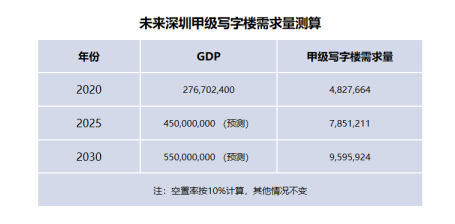 如果認為深圳的甲級寫字樓空置率保持在10%以內(nèi)是比較健康的,可以反推深圳的寫字樓大致需求量。按10%的空置率計算,深圳的GDP和甲級寫字樓存量的比值應(yīng)在57.31萬平方米左右,相應(yīng)的2020年甲級寫字樓全市場需求量約為482.8萬平方米,但實際深圳的甲級寫字樓存量已達628. 6萬平方米。即按照當(dāng)前的經(jīng)濟體量來說,深圳的甲級寫字樓確實蓋得太多了。根據(jù)中國(深圳)綜合開發(fā)研究院的預(yù)測,深圳2025年GDP總量將會達到4.2-4. 5萬億元?;谏鲜黾僭O(shè),則相應(yīng)的甲級寫字樓需求量大致在732-785萬平方米。