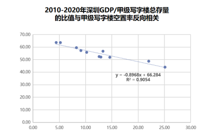 一個城市擁有多少寫字樓是合適的呢?通常來說一個城市經(jīng)濟發(fā)展得好,GDP總量較高,所需的寫字樓應(yīng)該也較多。58安居客房產(chǎn)研究院通過研究深圳單位面積甲級寫字樓的GDP產(chǎn)值發(fā)現(xiàn),過去十年間此變量與甲級寫字樓空置率呈現(xiàn)非常強的反向相關(guān)。此比值從2010年的55.82(萬/㎡)逐漸升至2014年的63.65,同時甲級寫字樓空置率從10.2%降至2014年最低時的4.4%;此后,該比值逐漸降低至2020年的44.02,而深圳寫字樓空置率也上升至25.1%。