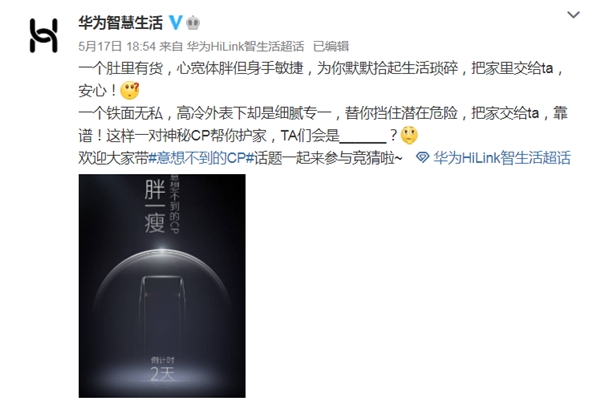 日前,@華為智慧生活 官方微博正式官宣#意想不到的CP#,“一對(duì)神秘CP幫你護(hù)家,TA們會(huì)是___?”簡(jiǎn)單的預(yù)熱文字中,“護(hù)家”、“靠譜”、“安心”等關(guān)鍵詞十分搶眼,吸引了不少網(wǎng)友前來(lái)競(jìng)猜,場(chǎng)面十分火熱。