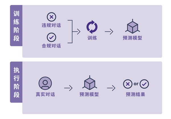 面對這種棘手的情況,循環(huán)智能(Recurrent AI)創(chuàng)造了一種新的“違規(guī)值”質(zhì)檢方式。這種新方法,并不關(guān)心具體哪句話違規(guī)了,而是專注計(jì)算整個會話違規(guī)的可能性。通過把整個對話(甚至同一個保單對應(yīng)的多個對話)當(dāng)成一個整體進(jìn)行機(jī)器學(xué)習(xí):在訓(xùn)練階段,將“違規(guī)”的整體對話和“沒違規(guī)”的整體對話輸入算法模型,學(xué)習(xí)“違規(guī)”對話的隱藏特征;在執(zhí)行階段,將新的對話輸入算法模型,然后計(jì)算該對話違規(guī)的概率。