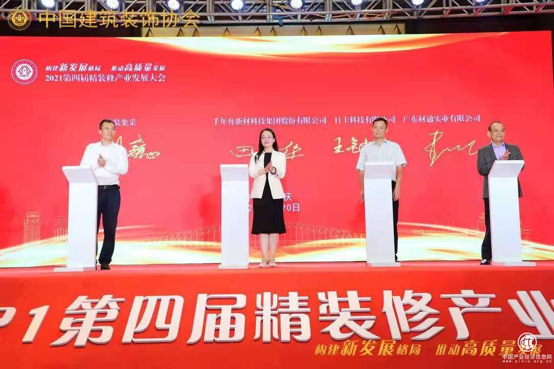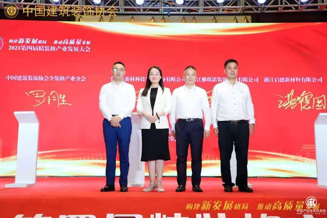 ▲中國建筑裝飾協(xié)會全裝修產(chǎn)業(yè)分會羅勝秘書長代表協(xié)會與千年舟新材科技集團股份有限公司副總裁田茂華、浙江雅琪諾裝飾材料有限公司董事長王旗、浙江啟德新材料有限公司董事長洪德園簽約戰(zhàn)略合作。