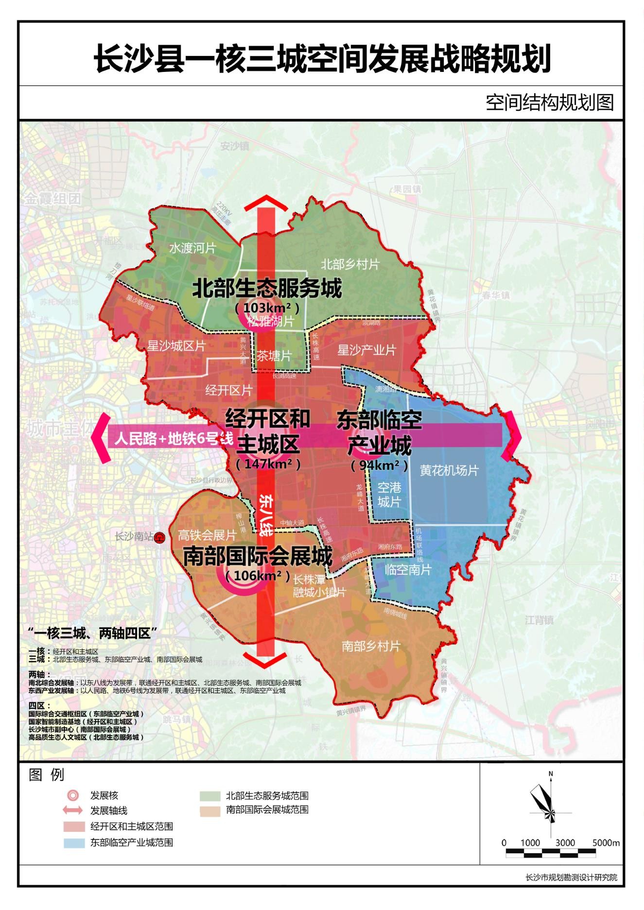 為加快從縣域經(jīng)濟(jì)示范向大都市區(qū)經(jīng)濟(jì)示范區(qū)的發(fā)展,長沙縣規(guī)劃構(gòu)建“一核三城,兩軸四區(qū)”的整體發(fā)展格局。其中,“一核”即長沙經(jīng)開區(qū)和星沙主城區(qū),“三城”即東部臨空產(chǎn)業(yè)城、南部會議會展城、北部生態(tài)服務(wù)城。